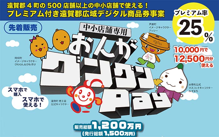 プレミアム25%付き遠賀郡広域デジタル商品券、販売総額1,200万円(発行総額1,500万円)おんがグングンPAYの販売のご案内です。